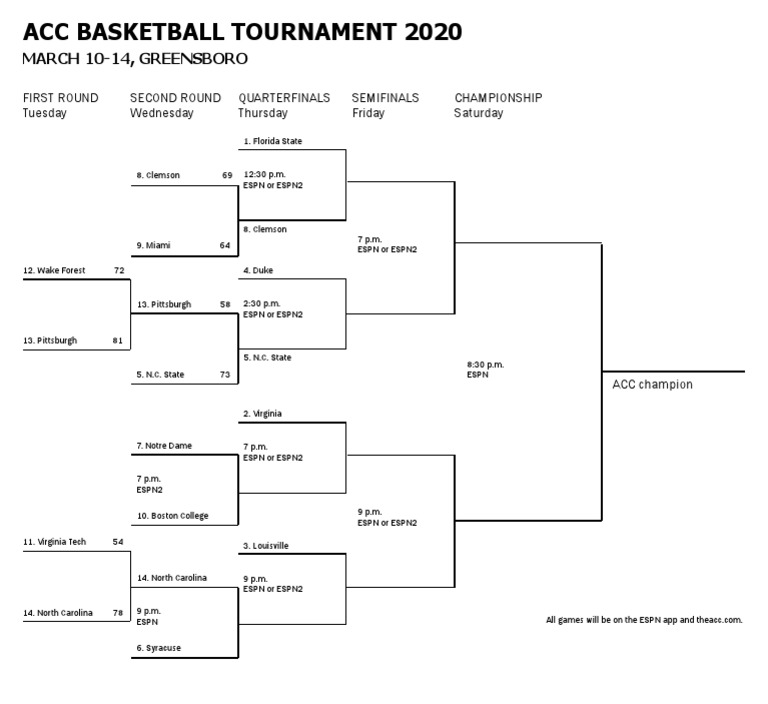 2022 New York Life ACC Men’s Basketball Tournament | Barclays ... The 2022 New York Life ACC Men’s Basketball Tournament returns to Brooklyn on March 8-12. March 8. Game 1: #12 seed v #13 seed - 2pm; Game 2: #10 seed v #15 seed - 4:30pm* Game 3: #11 seed v #14 seed - 7pm* March 9. Game 4: #8 seed v #9 seed - 12pm; Game 5: #5 seed v winner of game 1 - 2:30pm* Game 6: #7 seed v winner of game 2 - 7pm 2021–22 Atlantic Coast Conference men's basketball season ACC Tournament — Conference play will occur between December 2021 and will conclude in March with the 2022 ACC Men's Basketball Tournament at Barclays ...